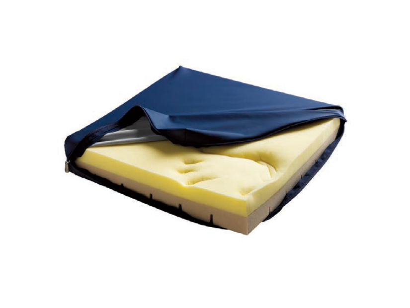 Cuscino multistrato viscoelastico con lato in poliuretano sagomato e lato in espanso a lenta memoria.